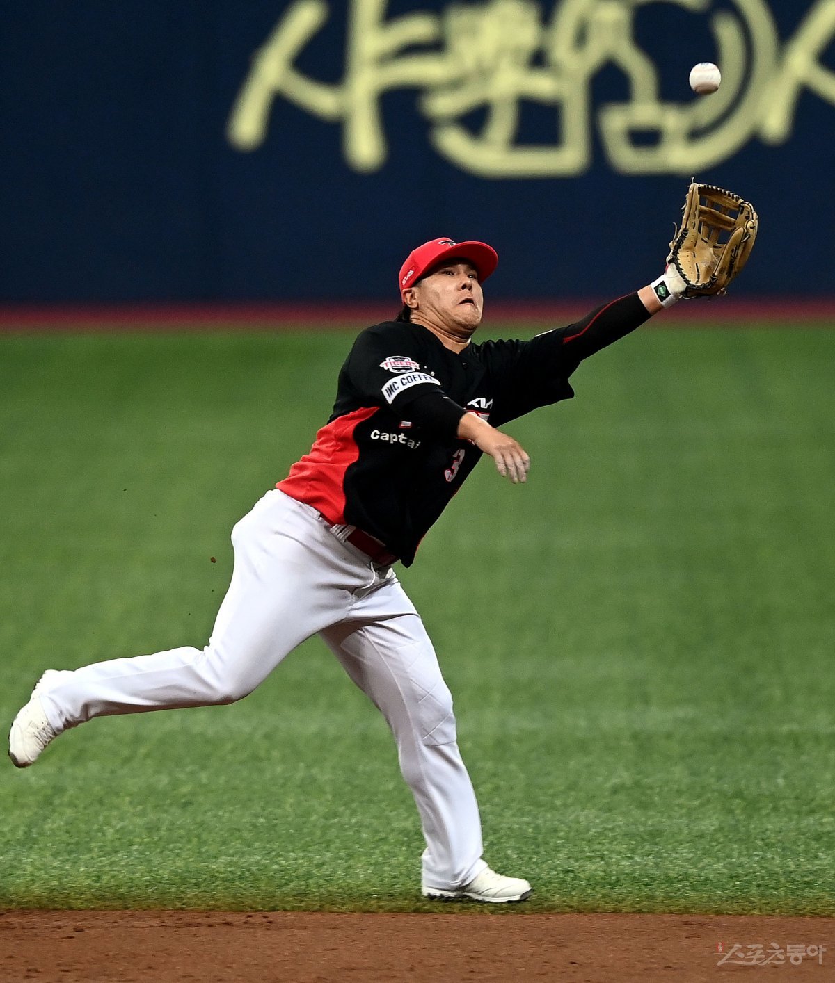 15일 서울 고척스카이돔에서 ‘2023 신한은행 SOL KBO리그’ 키움 히어로즈와 KIA 타이거즈의 경기가 열렸다. 1회말 2사 3루에서 KIA 김선빈이 플라이 타구를 잡아내고 있다.