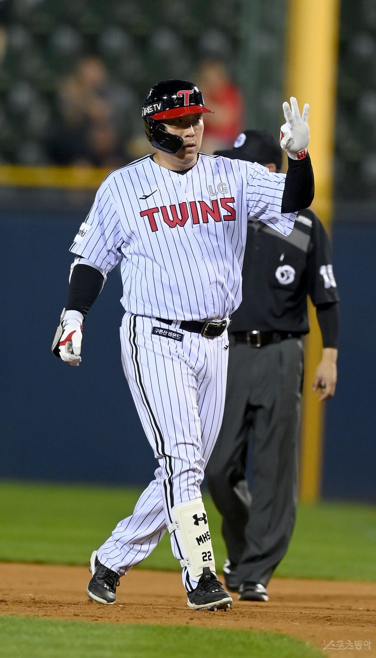 15일 서울 잠실야구장에서 ‘2023 신한은행 SOL KBO리그’ 삼성 라이온즈와 LG 트윈스 경기가 열렸다. 6회말 무사 LG 김현수가 좌전 안타를 치고 1루에서 기뻐하고 있다.