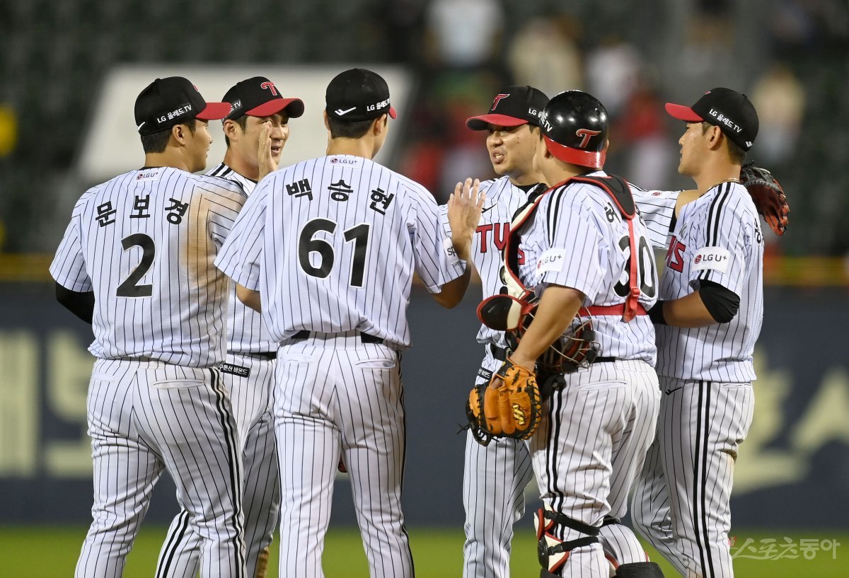 15일 서울 잠실야구장에서 ‘2023 신한은행 SOL KBO리그’ 삼성 라이온즈와 LG 트윈스 경기가 열렸다. 9-3 역전승을 거두며 1위를 탈환한 LG 선수들이 하이파이브 하고 있다.