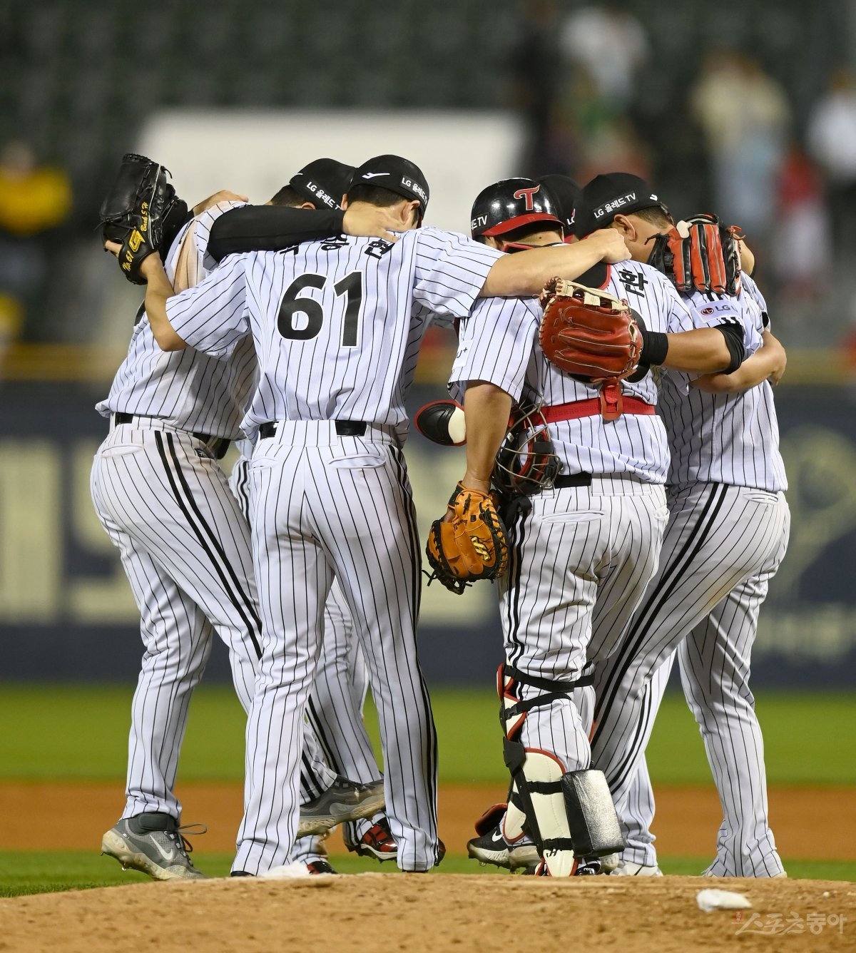 15일 서울 잠실야구장에서 ‘2023 신한은행 SOL KBO리그’ 삼성 라이온즈와 LG 트윈스 경기가 열렸다. 9-3 역전승을 거두며 1위를 탈환한 LG 선수들이 하이파이브 하고 있다.