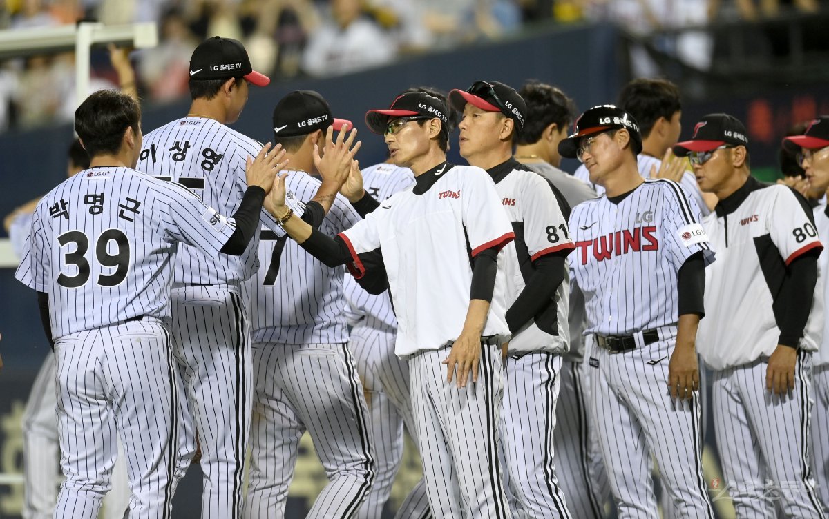 15일 서울 잠실야구장에서 ‘2023 신한은행 SOL KBO리그’ 삼성 라이온즈와 LG 트윈스 경기가 열렸다. 9-3 역전승을 거두며 1위를 탈환한 LG 염경엽 감독과 선수들이 하이파이브 하고 있다.