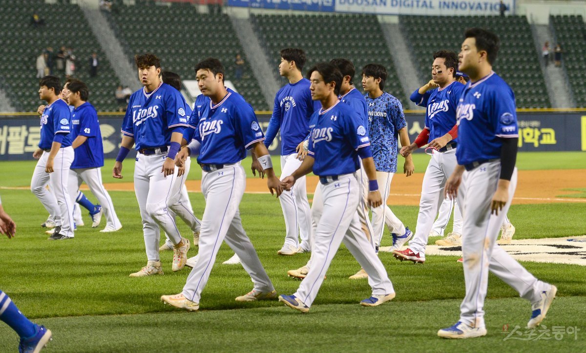 15일 서울 잠실야구장에서 ‘2023 신한은행 SOL KBO리그’ 삼성 라이온즈와 LG 트윈스 경기가 열렸다. 3-9로 패하며 LG전 스윕패한 삼성 선수들이 더그아웃으로 들어가고 있다.