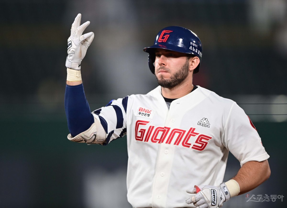 15일 부산 사직야구장에서 열린 ‘2023 신한은행 SOL KBO리그’ 롯데 자이언츠와 한화 이글스의 경기에서 9회말 2사 2루 롯데 렉스가 동점 1타점 적시타를 친 후 세리머니를 하고 있다.