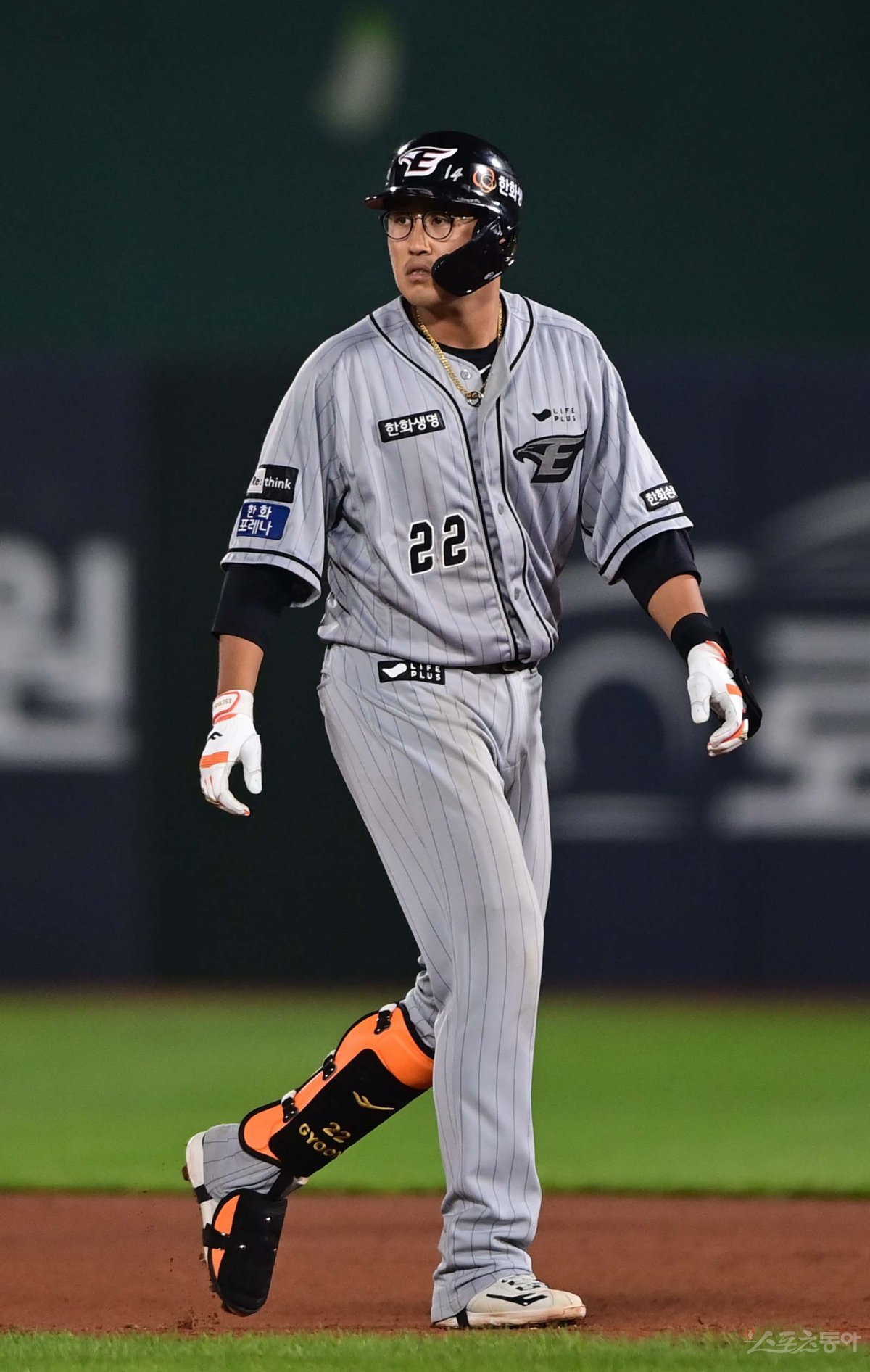 15일 부산 사직야구장에서 열린 ‘2023 신한은행 SOL KBO리그’ 롯데 자이언츠와 한화 이글스의 경기에서 연장 10회초 1사 만루 한화 채은성이 1타점 중전 적시타를 친 후 더그아웃을 바라보고 있다.