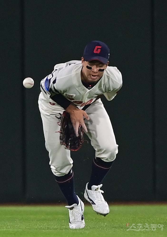 15일 부산 사직야구장에서 열린 ‘2023 신한은행 SOL KBO리그’ 롯데 자이언츠와 한화 이글스의 경기에서 연장 10회초 1사 만루 한화의 중전 적시타 때 롯데 중견수 김민석이 볼을 놓치고 있다.