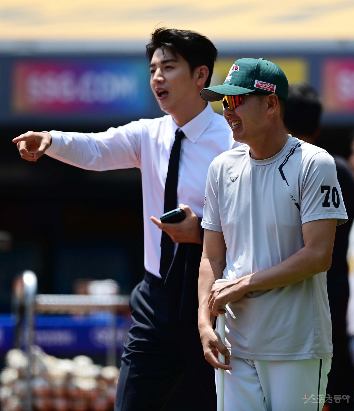 18일 인천 SSG랜더스필드에서 열린 ‘2023 신한은행 SOL KBO리그’ SSG 랜더스와 롯데 자이언츠의 경기에 앞서 SSG 김원형 감독이 이대형 해설위원의 장난에 웃고 있다.