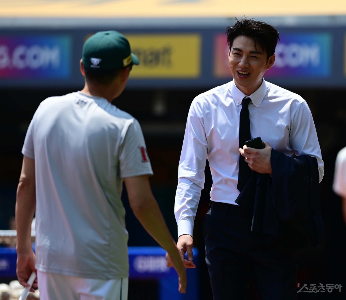 18일 인천 SSG랜더스필드에서 열린 ‘2023 신한은행 SOL KBO리그’ SSG 랜더스와 롯데 자이언츠의 경기에 앞서 이대형 해설위원이 SSG 감독과 인사하고 있다.