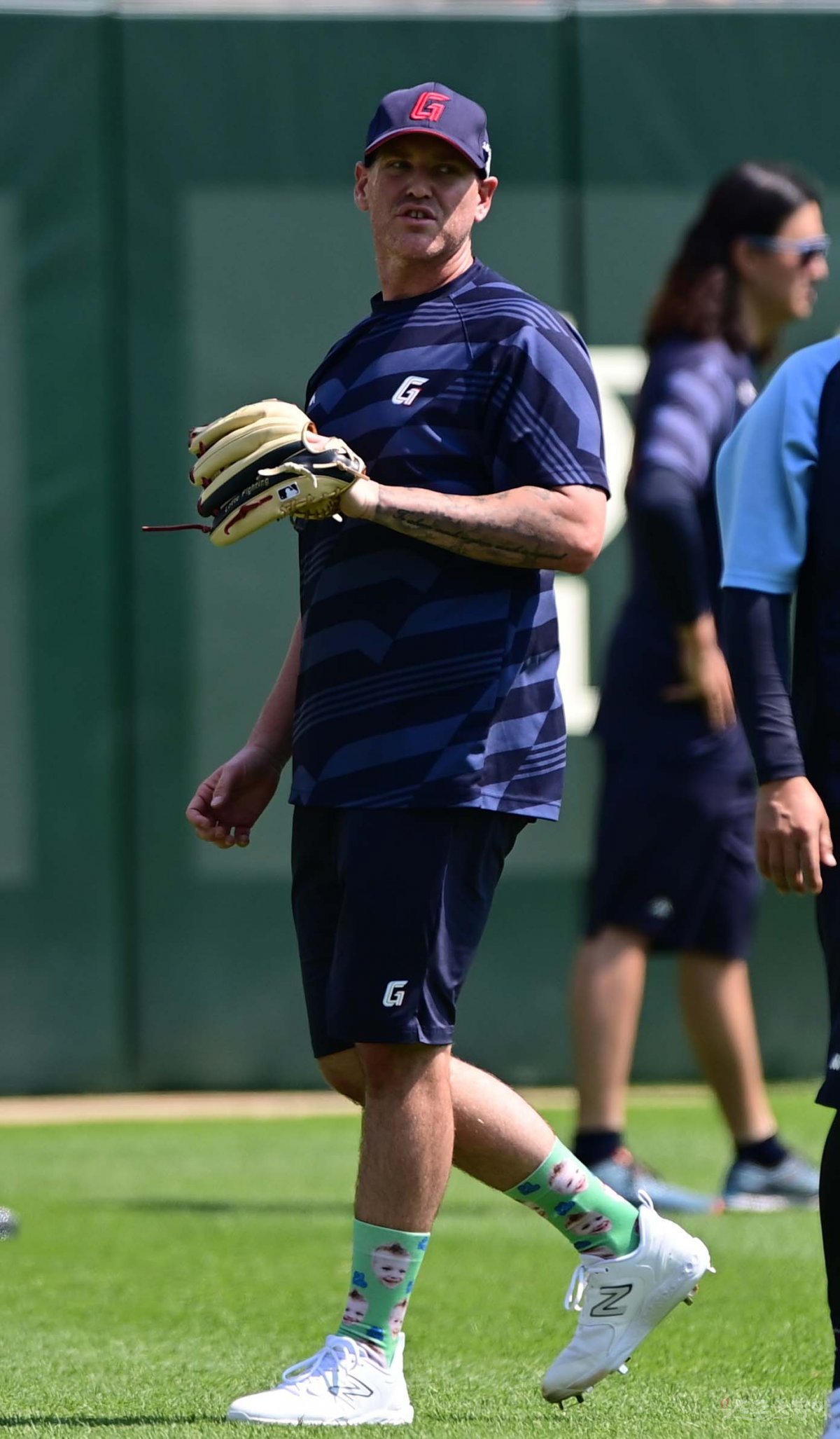 18일 인천 SSG랜더스필드에서 열린 ‘2023 신한은행 SOL KBO리그’ SSG 랜더스와 롯데 자이언츠의 경기에 앞서 롯데 스트레일리가 수염을 깎은 채 훈련을 하고 있다.
