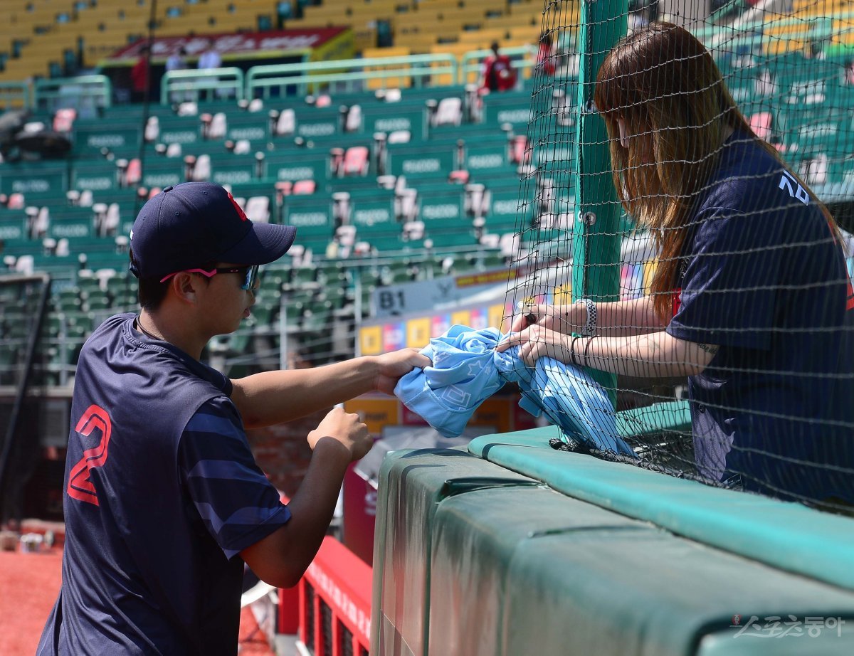 18일 인천 SSG랜더스필드에서 열린 ‘2023 신한은행 SOL KBO리그’ SSG 랜더스와 롯데 자이언츠의 경기에 앞서 롯데 김민석이 사인을 위해 팬의 유니폼을 받고 있다.