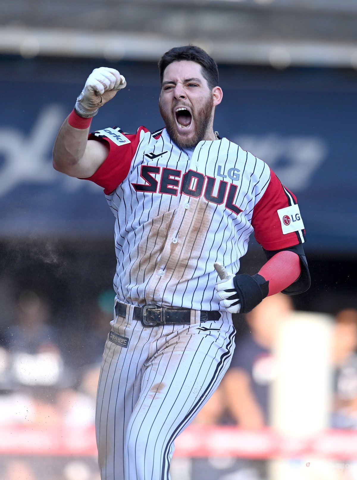 18일 서울 잠실야구장에서 ‘2023 신한은행 SOL KBO리그’ 두산 베어스와 LG 트윈스 경기가 열렸다. 3회말 1사 2루 LG 오스틴이 그라운드 홈런을 치고 홈에서 환호하고 있다.