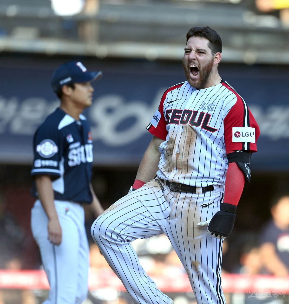 18일 서울 잠실야구장에서 ‘2023 신한은행 SOL KBO리그’ 두산 베어스와 LG 트윈스 경기가 열렸다. 3회말 1사 2루 LG 오스틴이 그라운드 홈런을 치고 홈에서 환호하고 있다.