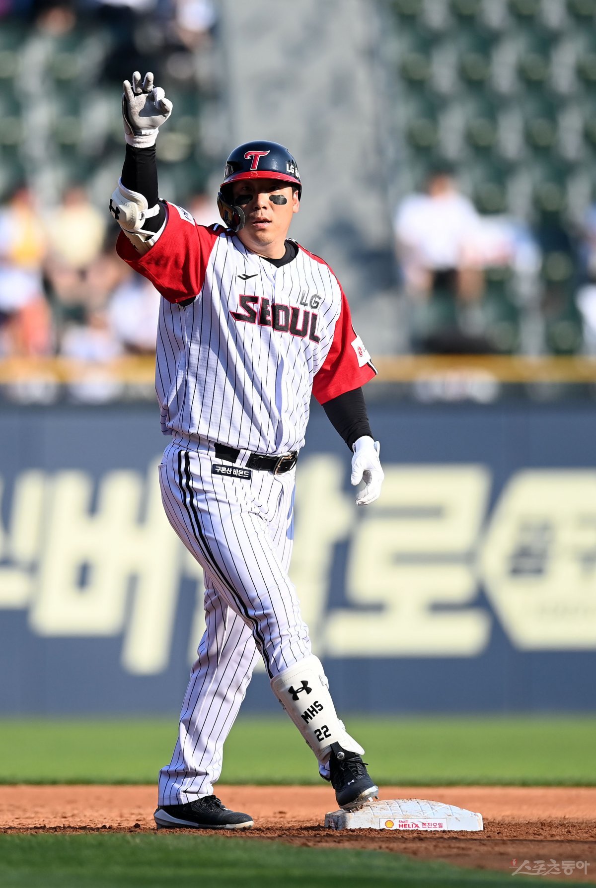 18일 서울 잠실야구장에서 ‘2023 신한은행 SOL KBO리그’ 두산 베어스와 LG 트윈스 경기가 열렸다. 3회말 1사 1,3루 LG 김현수가 2타점 우전 2루타를 치고 2루에서 기뻐하고 있다.