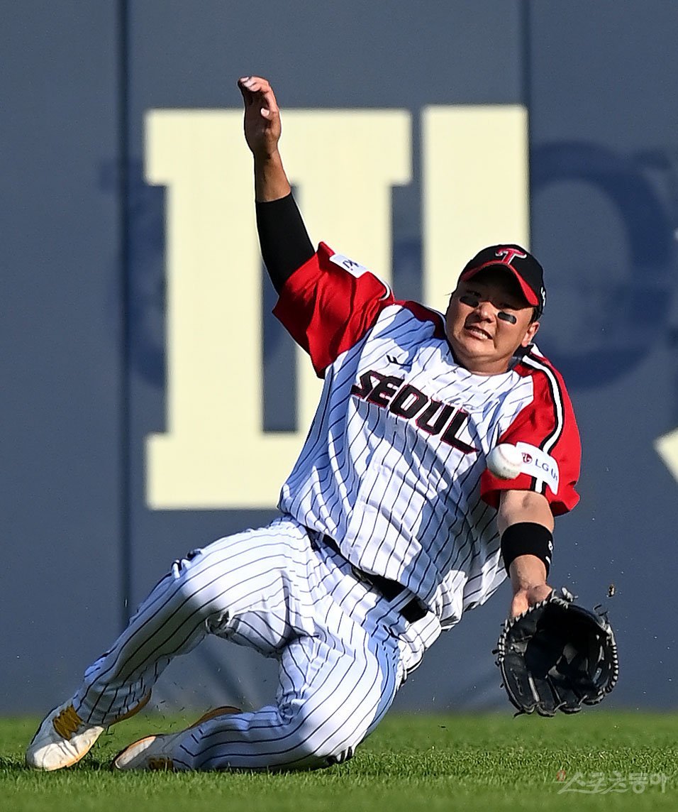 18일 서울 잠실야구장에서 ‘2023 신한은행 SOL KBO리그’ 두산 베어스와 LG 트윈스 경기가 열렸다. 2회초 무사 LG 이재원이 다이빙캐치를 시도했으나 농치고 있다.