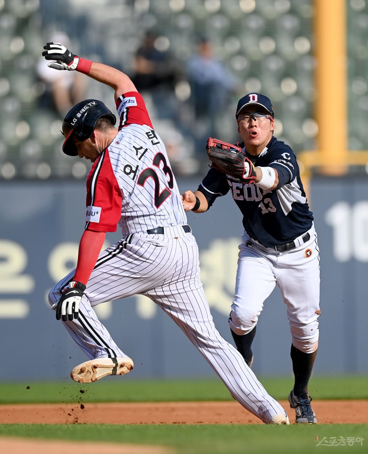 18일 서울 잠실야구장에서 ‘2023 신한은행 SOL KBO리그’ 두산 베어스와 LG 트윈스 경기가 열렸다. 1회말 1사 2루 LG 내야 땅볼 때 두산 허경민이 2루주자 오스틴을 태그 아웃시키고 있다.