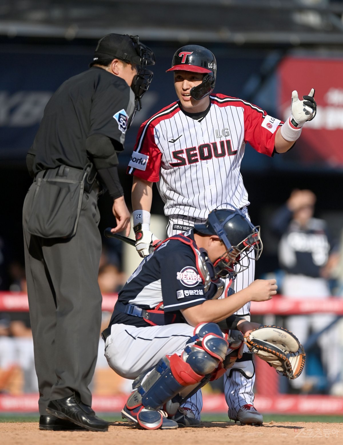 18일 서울 잠실야구장에서 ‘2023 신한은행 SOL KBO리그’ 두산 베어스와 LG 트윈스 경기가 열렸다. 1회말 2사 1루 LG 박동원이 타석에서 심판에게 무언가를 이야기하고 있다.