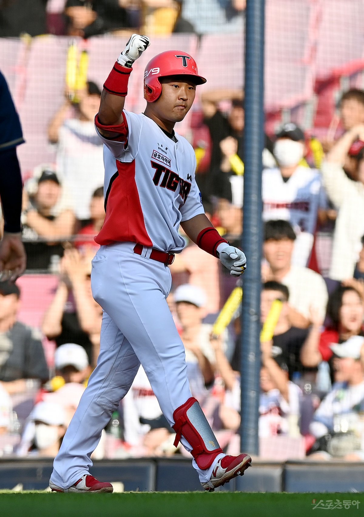 18일 광주기아챔피언스필드에서 ‘2023 신한은행 SOL KBO리그’ KIA 타이거즈와 NC 다이노스의 경기가 열렸다. 2회말 1사 만루에서 KIA 신범수가 동점 2타점 적시타를 날린 후 환호하고 있다.
