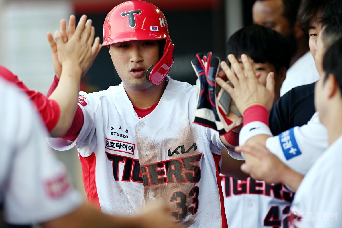 18일 광주기아챔피언스필드에서 ‘2023 신한은행 SOL KBO리그’ KIA 타이거즈와 NC 다이노스의 경기가 열렸다. 2회말 2사 1, 3루에서 KIA 변우헉이 투수 견제 실책으로 득점을 올린 후 동료들의 환영을 받고 있다.