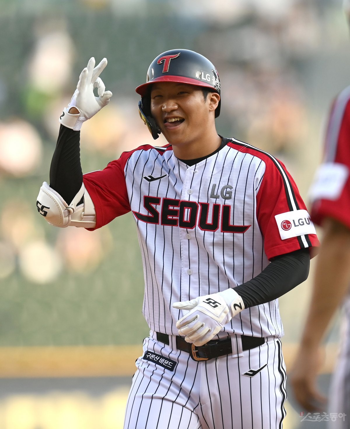 18일 서울 잠실야구장에서 ‘2023 신한은행 SOL KBO리그’ 두산 베어스와 LG 트윈스 경기가 열렸다. 4회말 2사 LG 문보경이 중전 안타를 치고 1루에서 기뻐하고 있다.