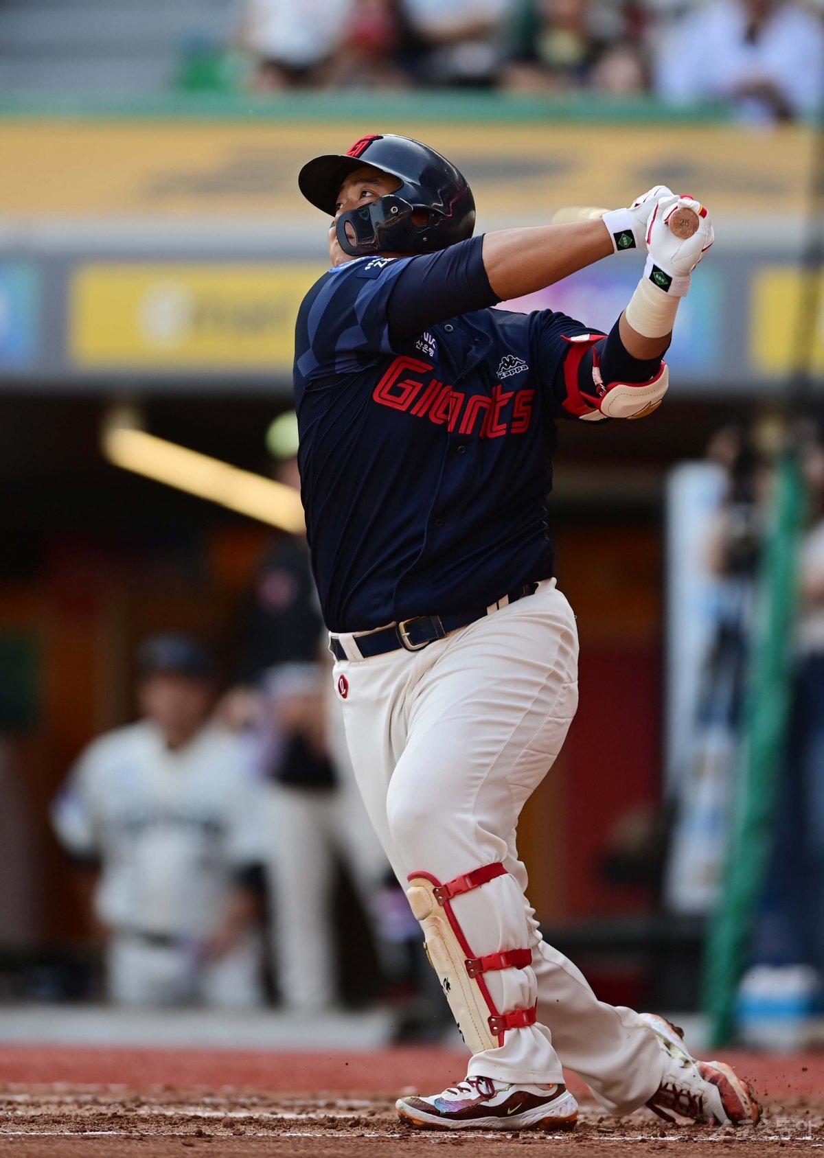 18일 인천 SSG랜더스필드에서 열린 ‘2023 신한은행 SOL KBO리그’ SSG 랜더스와 롯데 자이언츠의 경기에서 3회초 1사 1, 2루 롯데 한동희가 1타점 좌전 2루타를 치고 있다.