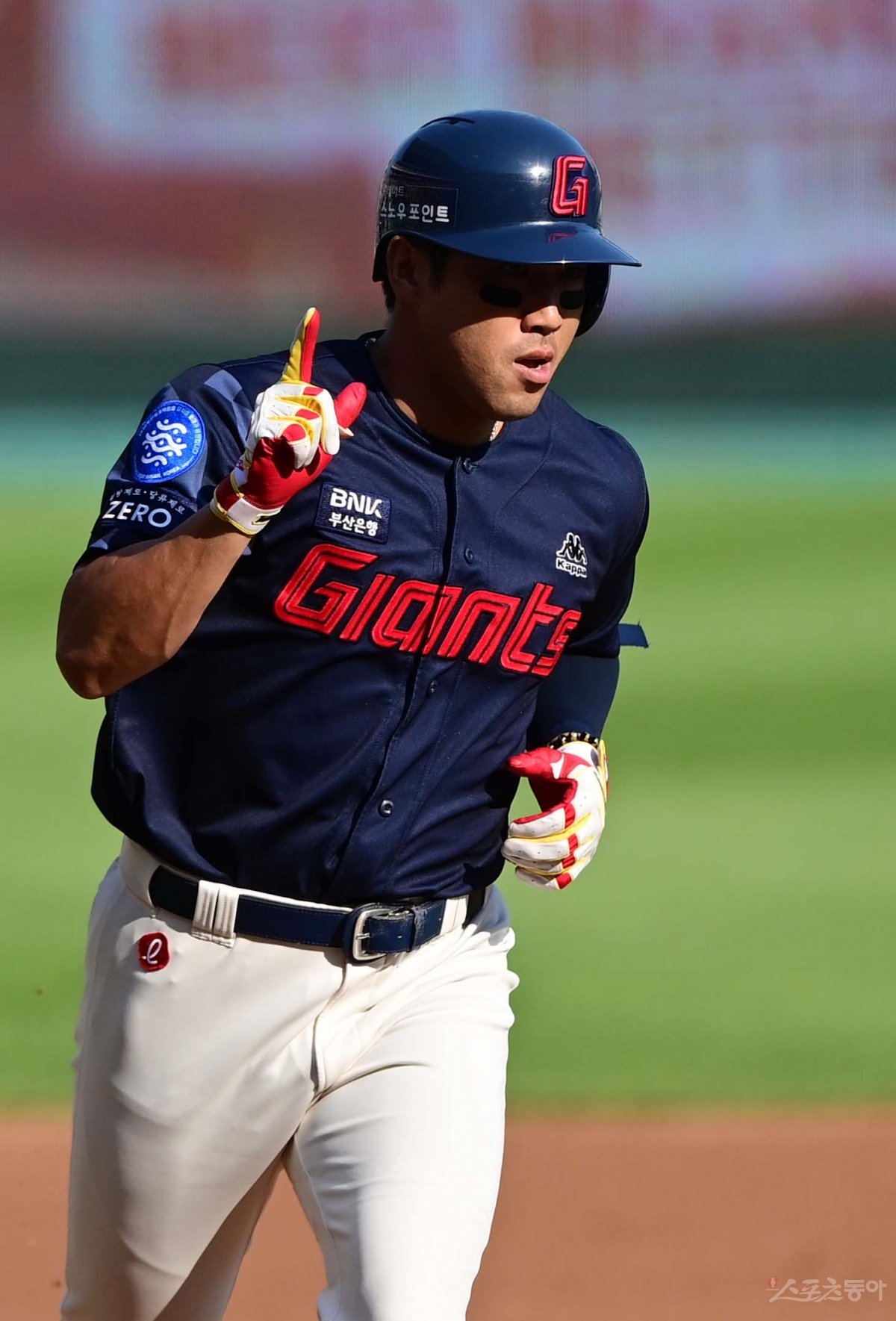 18일 인천 SSG랜더스필드에서 열린 ‘2023 신한은행 SOL KBO리그’ SSG 랜더스와 롯데 자이언츠의 경기에서 1회초 1사 롯데 전준우가 솔로 홈런을 친 후 세리머니를 하고 있다.