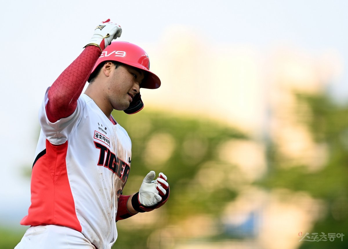 18일 광주기아챔피언스필드에서 ‘2023 신한은행 SOL KBO리그’ KIA 타이거즈와 NC 다이노스의 경기가 열렸다. 6회말 1사에서 KIA 변우혁이 솔로 홈런을 쏘아 올린 후 환호하고 있다.