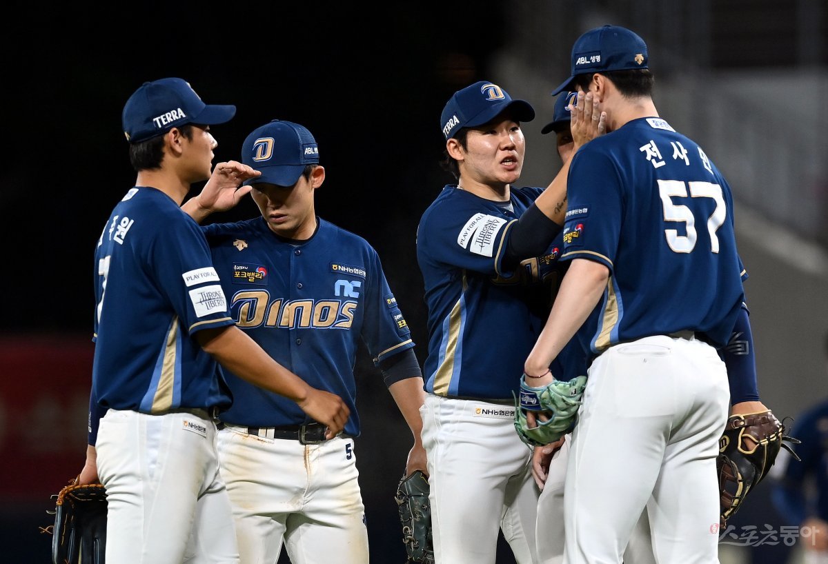 18일 광주기아챔피언스필드에서 ‘2023 신한은행 SOL KBO리그’ KIA 타이거즈와 NC 다이노스의 경기가 열렸다. KIA와 NC가 연장 12회 7-7 무승부를 기록한 뒤 NC 선수들이 그라운드에서 서로 격려하고 있다.