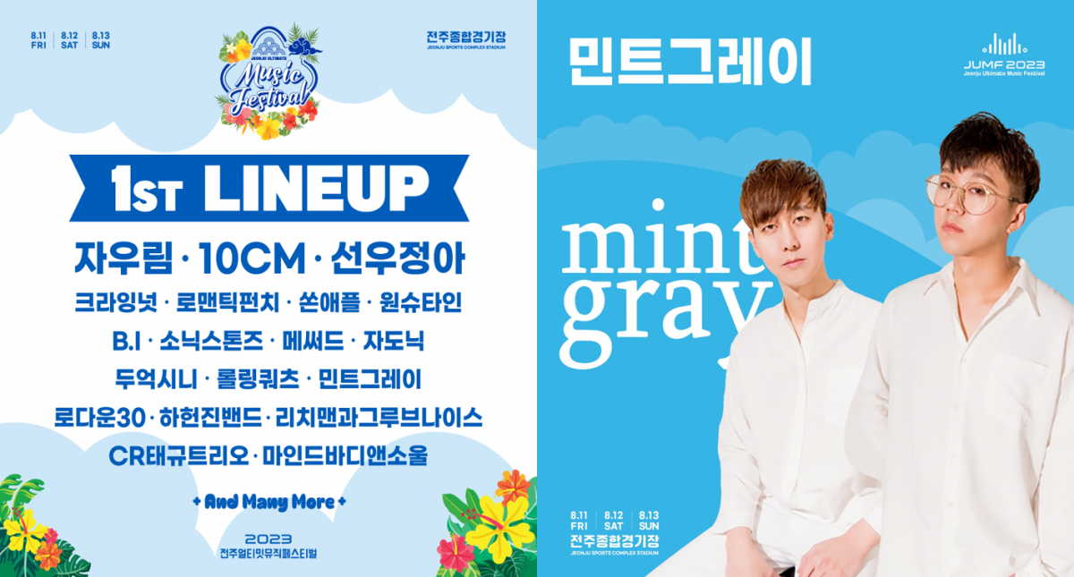 오는 8월 11일부터 13일까지 3일간 전주종합경기장에서 열리는 ‘JUMF 2023’ 1차 라인업에는 민트그레이, 자우림, 10CM, 선우정아, 크라잉넛, 로맨틱펀치, 쏜애플, 원슈타인, B.I, 소닉스톤즈, 메써드, 자도닉, 두억시니, 롤링쿼츠, 로다운30, 하헌진밴드, 리치맨과그루브나이스, CR태규트리오, 마인드바디앤소울 등의 많은 뮤지션들이 참여한다.