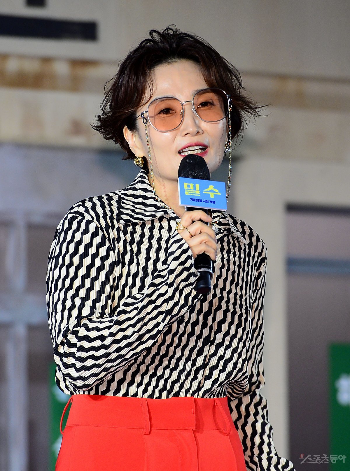 방송인 박경림이 20일 서울 광진구 자양동 롯데시네마 건대입구점에서 열린 영화 ‘밀수’ 제작보고회에 참석해 행사를 진행하고 있다.