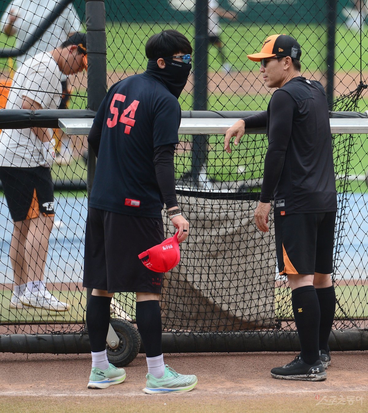 20일 대전 한화생명이글스파크에서 ‘2023 신한은행 SOL KBO리그’ KIA 타이거즈와 한화 이글스 경기가 열린다. KIA 양현종과 한화 이대진 코치가 이야기를 하고 있다.
