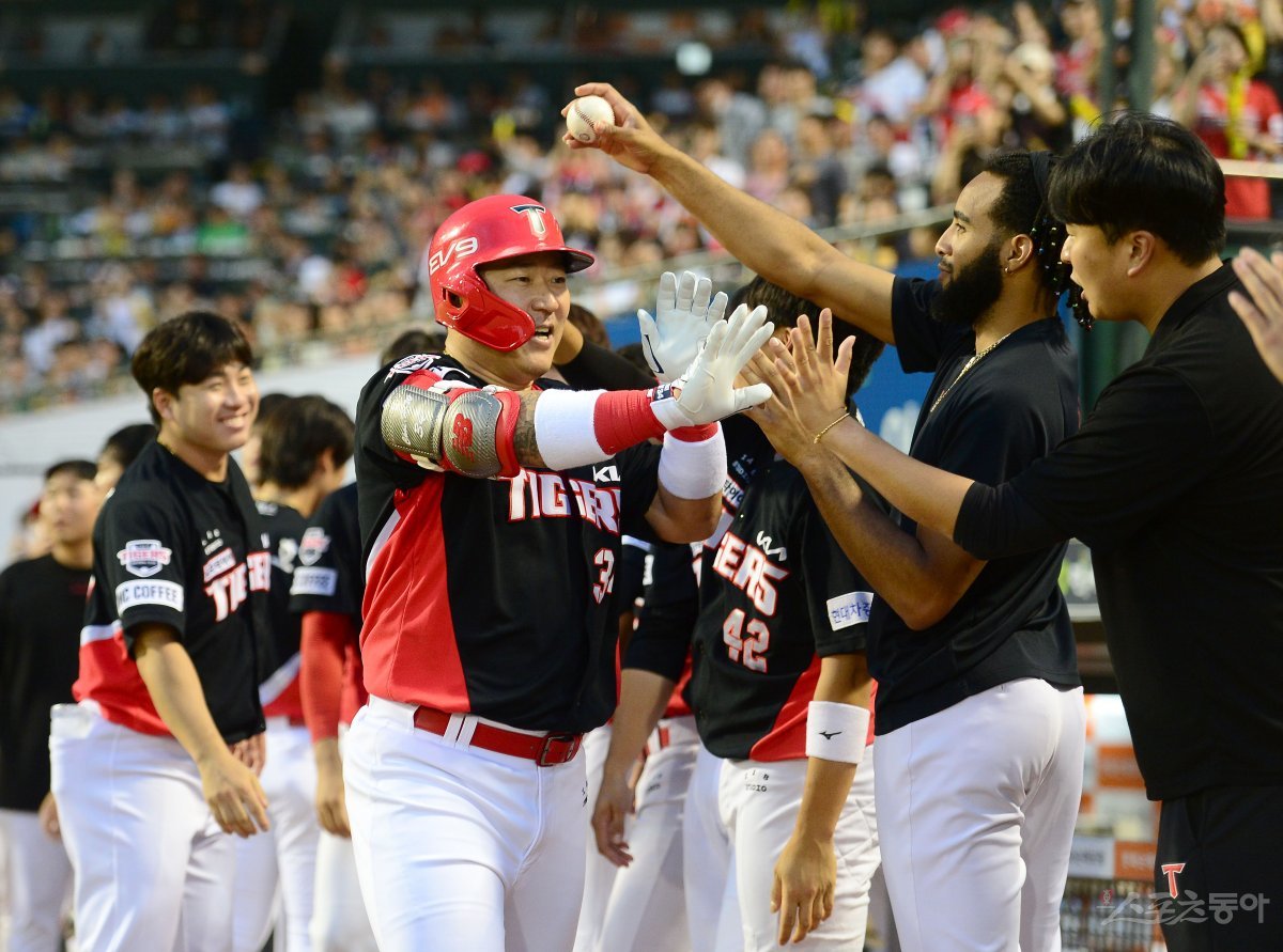 20일 대전 한화생명이글스파크에서 ‘2023 신한은행 SOL KBO리그’ KIA 타이거즈와 한화 이글스 경기가 열렸다. 4회초 1사 1루 KIA 최형우가 중월 투런 홈런을 날린 후 그라운드를 돌아 홈인해 하이파이브 하고 있다.