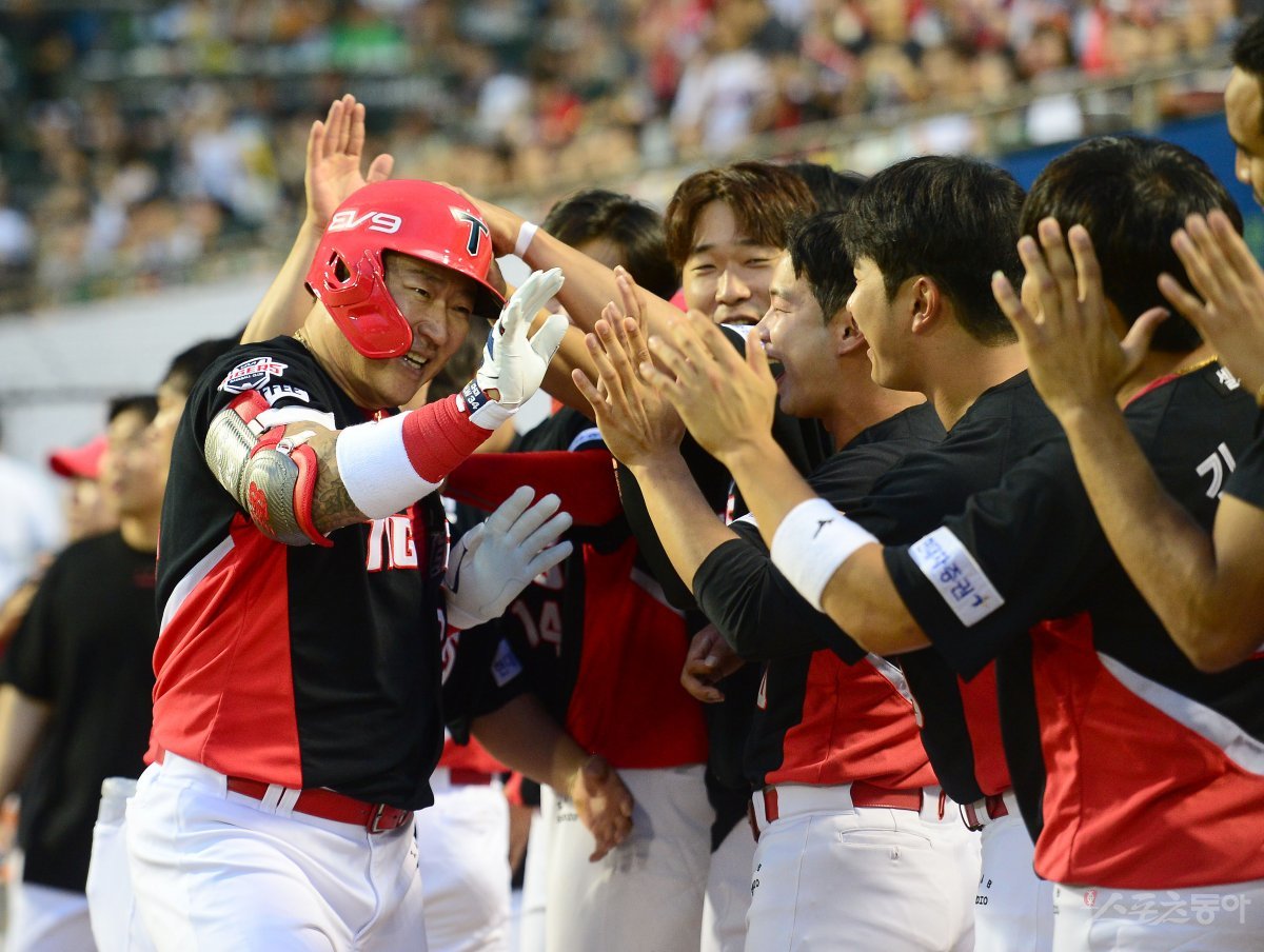 20일 대전 한화생명이글스파크에서 ‘2023 신한은행 SOL KBO리그’ KIA 타이거즈와 한화 이글스 경기가 열렸다. 4회초 1사 1루 KIA 최형우가 중월 투런 홈런을 날린 후 그라운드를 돌아 홈인해 하이파이브 하고 있다.