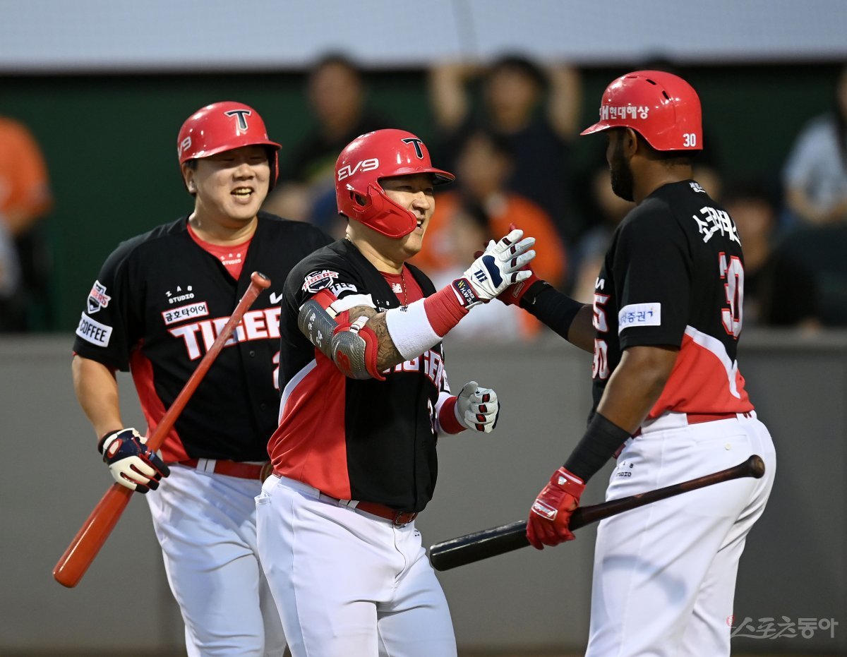 20일 대전 한화생명이글스파크에서 ‘2023 신한은행 SOL KBO리그’ KIA 타이거즈와 한화 이글스 경기가 열렸다. 4회초 1사 1루 KIA 최형우가 중월 투런 홈런을 날린 후 그라운드를 돌아 홈인해 하이파이브 하고 있다.