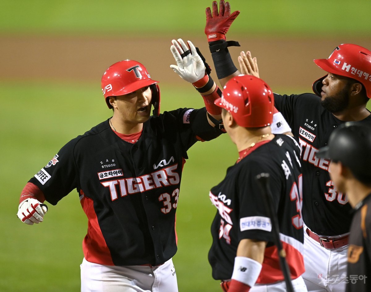 20일 대전 한화생명이글스파크에서 ‘2023 신한은행 SOL KBO리그’ KIA 타이거즈와 한화 이글스 경기가 열렸다. 6회초 1사 1,2루 KIA 변우혁이 좌월 스리런 홈런을 날리고 그라운드를 돌하 홈인해 기뻐하고 있다.