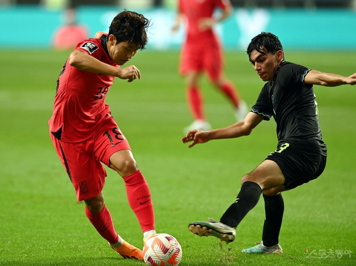 20일 대전월드컵경기장에서 열린 한국과 엘살바도르의 평가전 경기에서 한국 이강인이 엘살바도르 수비를 앞에 두고 돌파를 시도하고 있다.