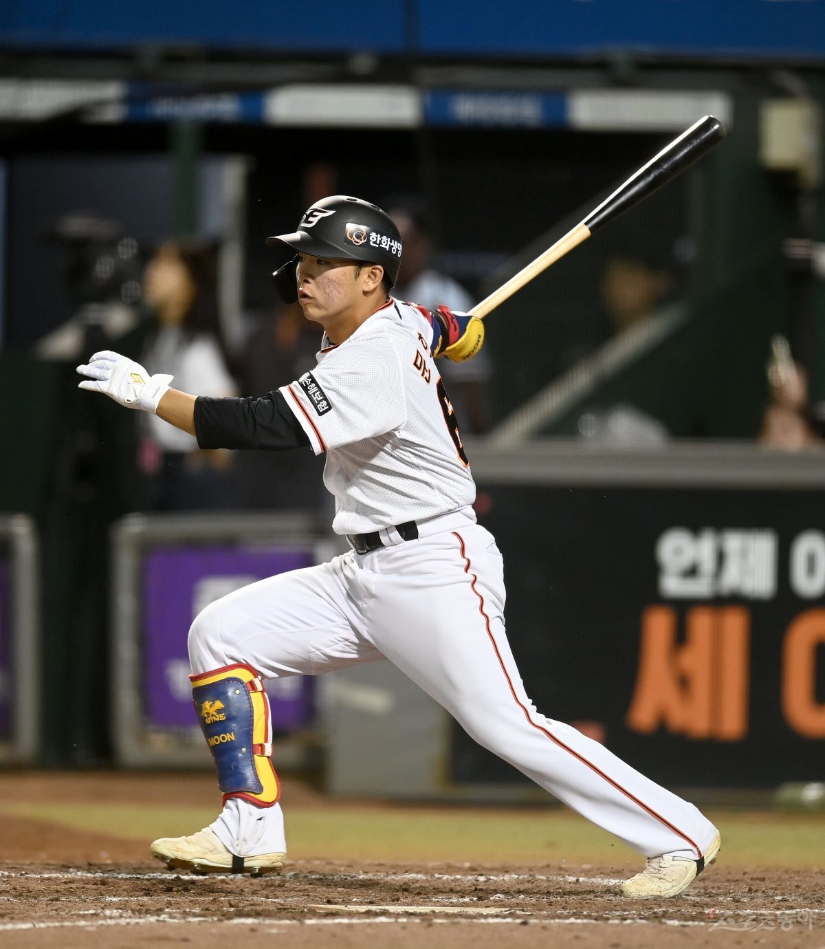 20일 대전 한화생명이글스파크에서 ‘2023 신한은행 SOL KBO리그’ KIA 타이거즈와 한화 이글스 경기가 열렸다. 9회말 무사 1루 한화 문현빈이 중전 안타를 치고 있다.