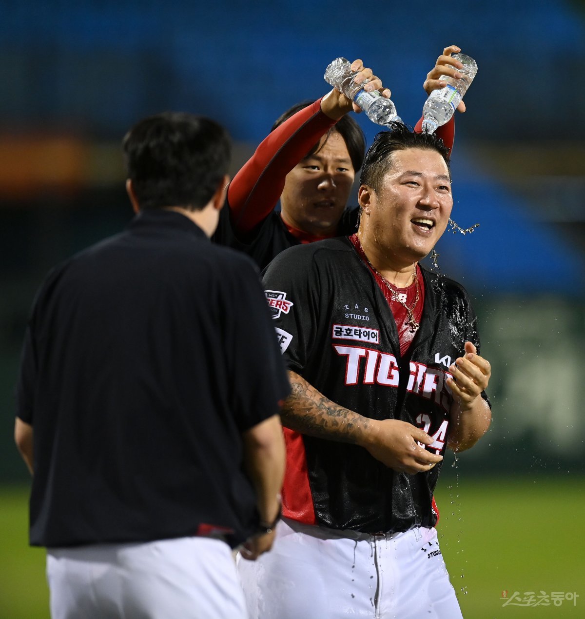 20일 대전 한화생명이글스파크에서 ‘2023 신한은행 SOL KBO리그’ KIA 타이거즈와 한화 이글스 경기가 열렸다. KBO리그 통산 1500 타점을 달성한 KIA 최형우가 동료들에게 물세례를 받고 있다.