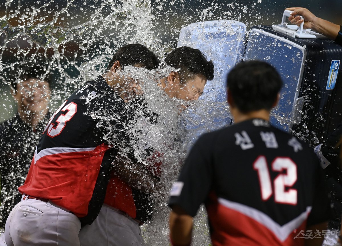 20일 대전 한화생명이글스파크에서 ‘2023 신한은행 SOL KBO리그’ KIA 타이거즈와 한화 이글스 경기가 열렸다. KBO리그 통산 1500 타점을 달성한 KIA 최형우가 동료들에게 물세례를 받고 있다.