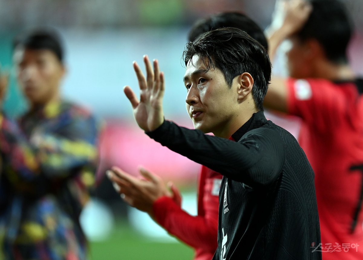 20일 대전월드컵경기장에서 열린 한국과 엘살바도르의 평가전 경기에서 한국 이강인이 무승부를 기록한 후 팬들에게 인사하고 있다.