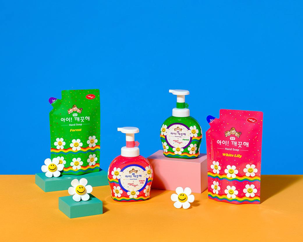라이프스타일 브랜드 위글위글과 협업했으며, ‘아이! 깨끗해’가 추구하는 ‘즐거운 손 씻기’라는 메시지 전달을 위해 기획했다. 여름휴가를 테마로 위글위글의 복고풍 및 컬러풀한 디자인을 적용했으며, 캠핑 및 피크닉 시 활용도가 높은 보냉백과 피크닉백을 세트상품으로 구성했다. 향은 화이트 릴리향과 숲속 산책향으로 꾸렸다.