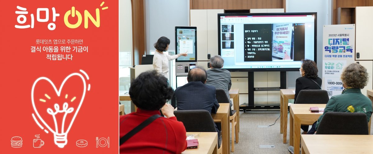 ‘희망ON 프로젝트’ 포스터(왼쪽)와 ‘디지털 마실’ 교육 모습. 사진제공|롯데GRS