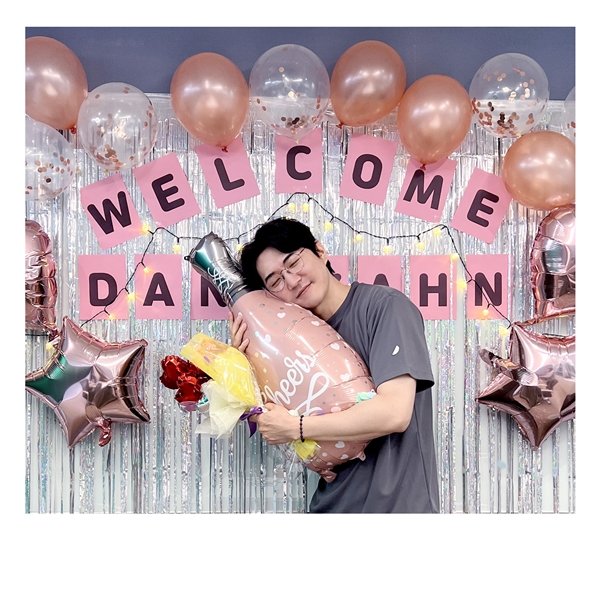 또 다른 이미지에서는 샴페인 병 모양의 풍선과 꽃다발 모양 풍선을 안고 행복한 미소를 짓는 듯한 데니안의 모습이 담겼다. 배경에는 데니안의 공식 인스타그램을 축하하는 문구와 다양한 풍선들이 배경을 장식하며 즐거운 파티 분위기를 담아냈다.