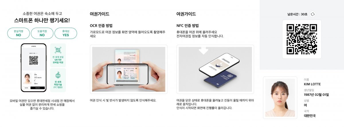 롯데면세점은 OCR과 전자여권 IC칩을 활용한 양방향 인증을 통해 보안성을 강화했으며, 외교부와 법무부의 공공전산망 데이터베이스를 활용한 실시간 검증도 진행해 여권의 유효기간과 체류기간 등을 확인한다. 모바일여권 사용 시 생성되는 QR코드는 30초 간격으로 재생성해 부정사용을 원천 차단했다.