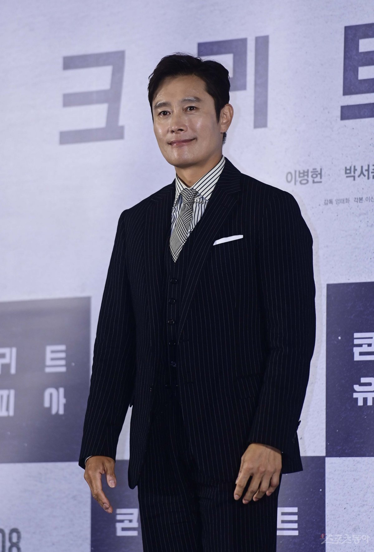 배우 이병헌이 21일 서울 광진구 자양동 롯데시네마 건대입구점에서 열린 영화 ‘콘크리트 유토피아’ 제작보고회에서 포즈를 취하고 있다.