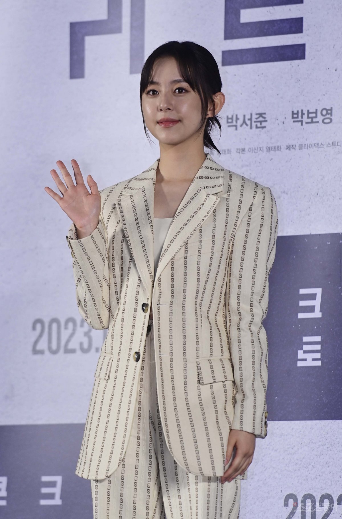 배우 박지후가 21일 서울 광진구 자양동 롯데시네마 건대입구점에서 열린 영화 ‘콘크리트 유토피아’ 제작보고회에서 포즈를 취하고 있다.