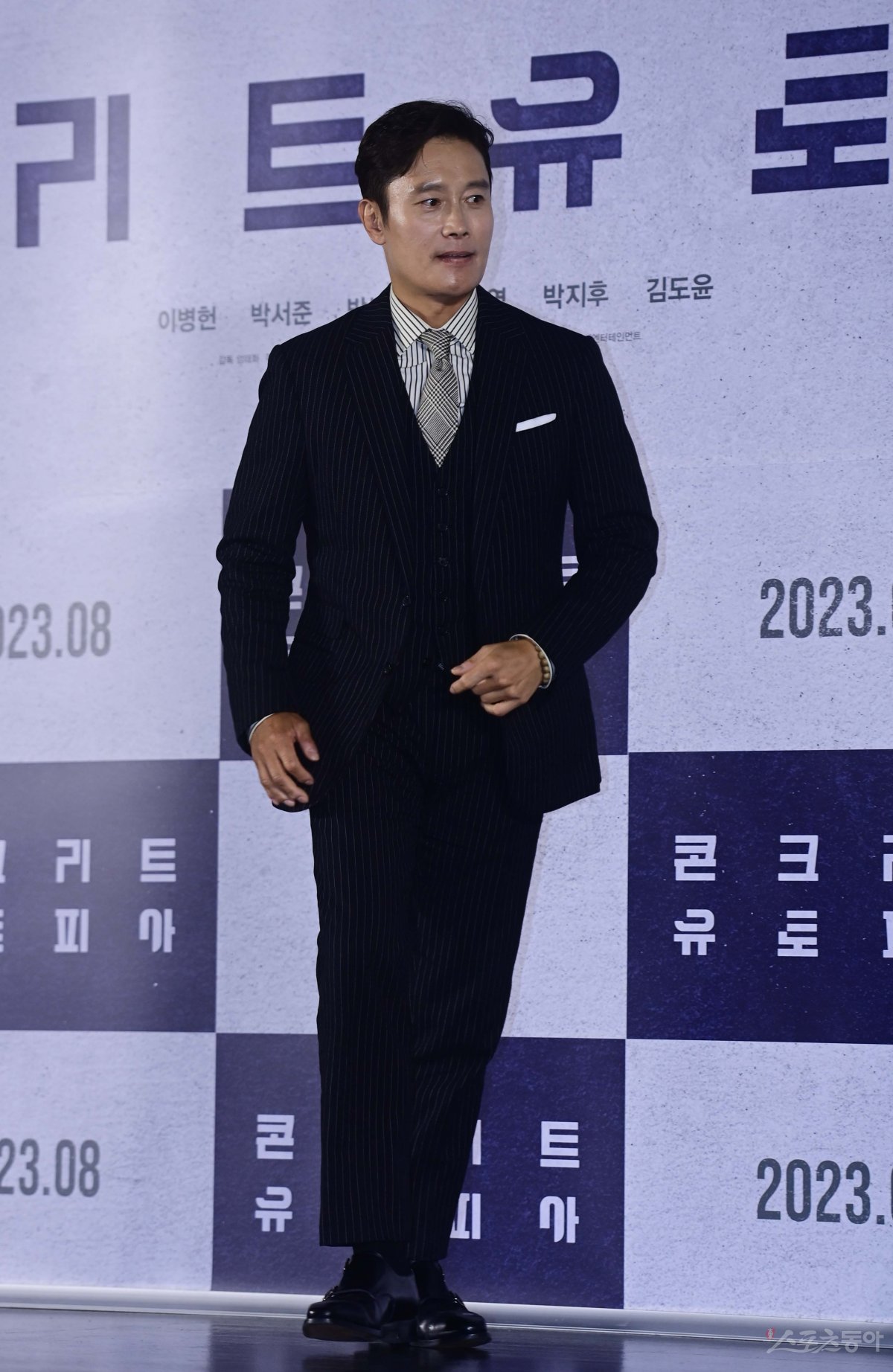 배우 이병헌이 21일 서울 광진구 자양동 롯데시네마 건대입구점에서 열린 영화 ‘콘크리트 유토피아’ 제작보고회에서 포즈를 취하고 있다.