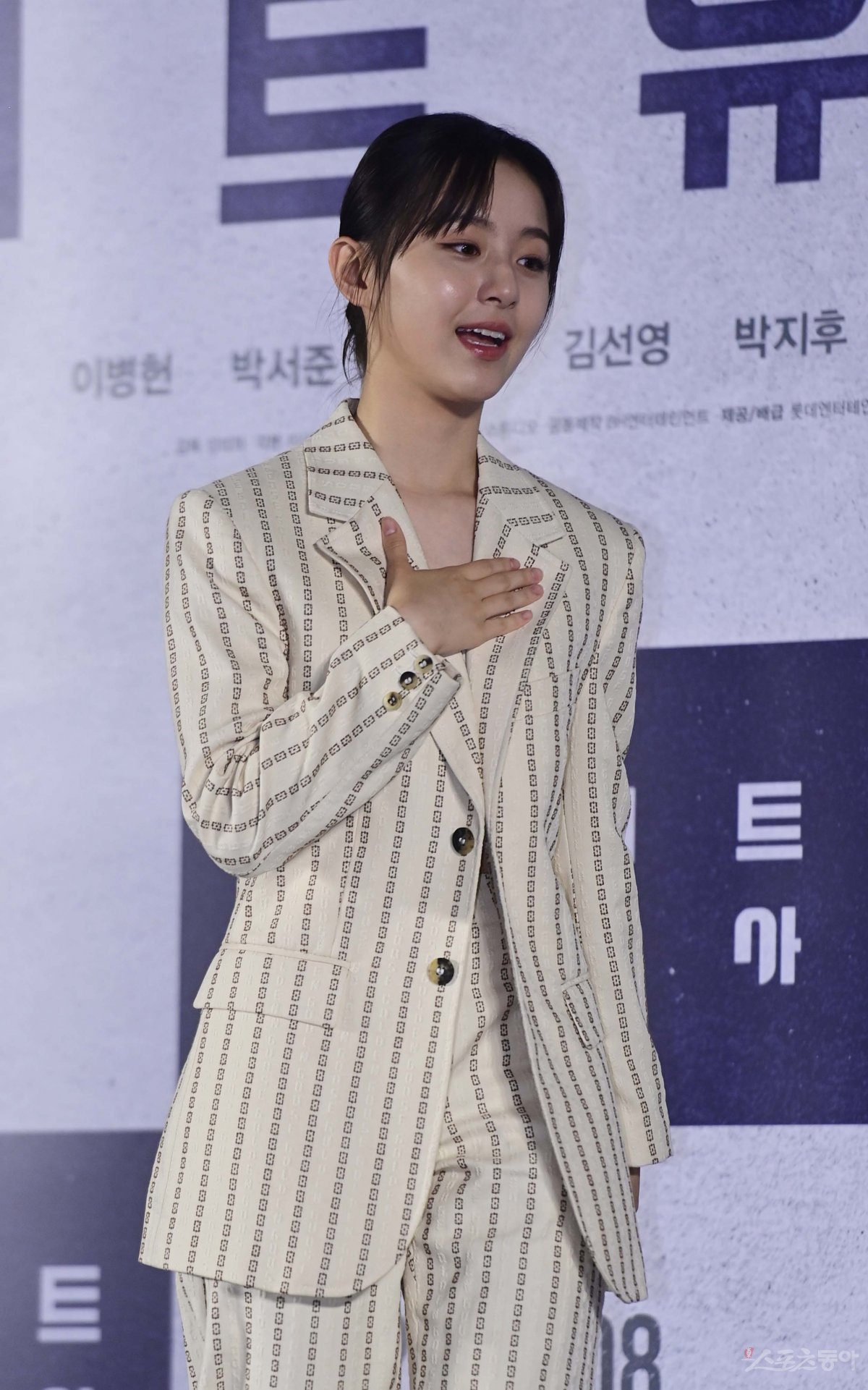 배우 박지후가 21일 서울 광진구 자양동 롯데시네마 건대입구점에서 열린 영화 ‘콘크리트 유토피아’ 제작보고회에서 포즈를 취하고 있다.