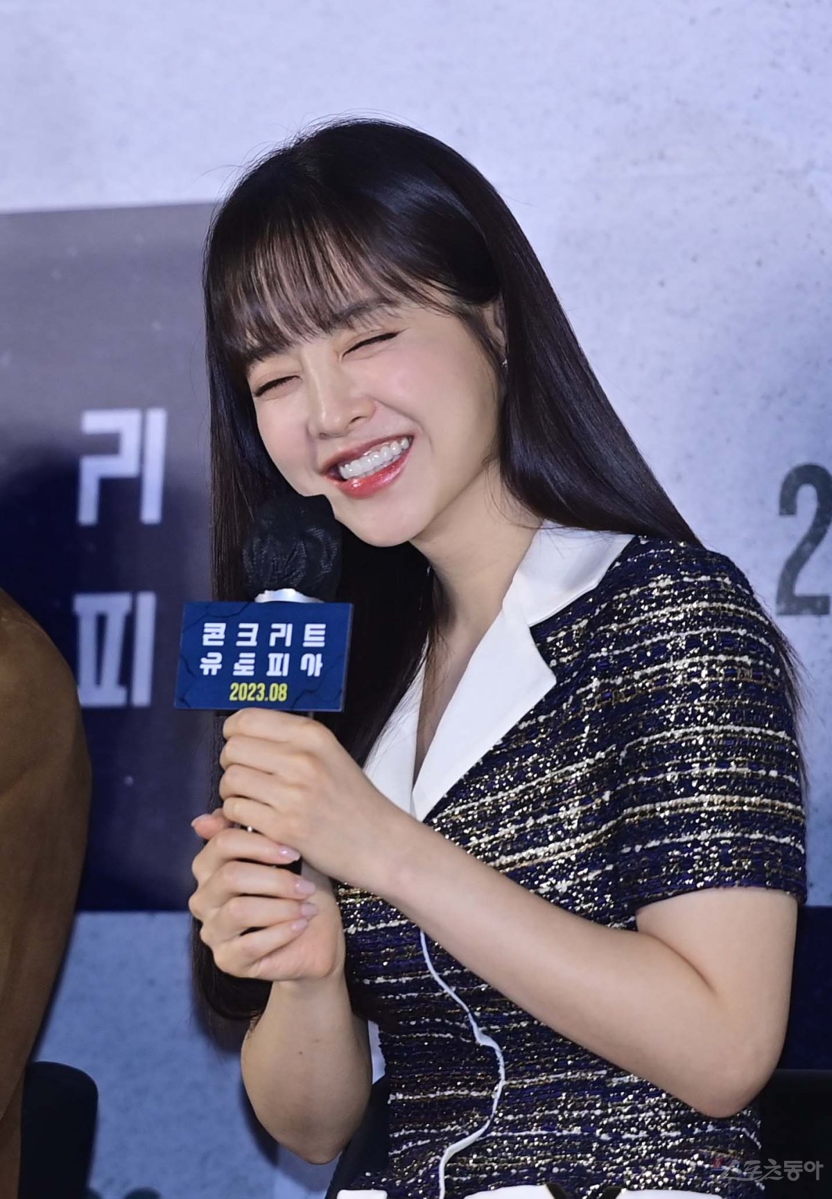 배우 박보영이 21일 서울 광진구 자양동 롯데시네마 건대입구점에서 열린 영화 ‘콘크리트 유토피아’ 제작보고회에서 답변을 마친 후 웃고 있다.
