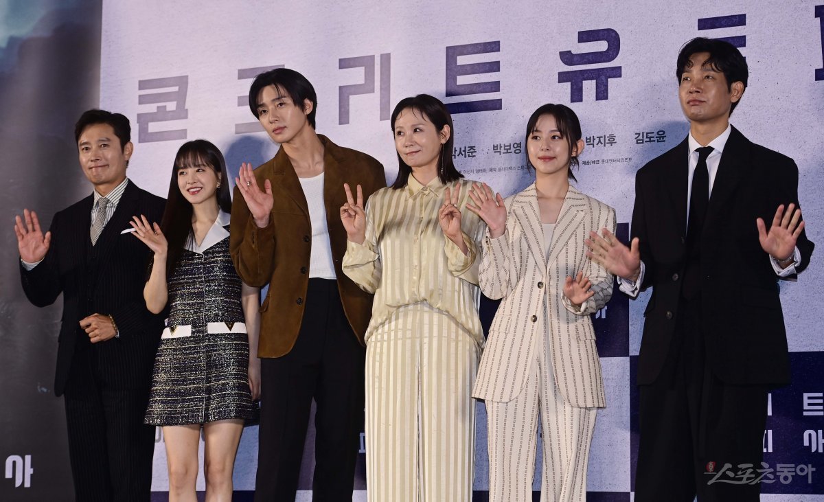 배우 이병헌, 박보영, 박서준, 김선영, 박지후, 김도윤이 21일 서울 광진구 자양동 롯데시네마 건대입구점에서 열린 영화 ‘콘크리트 유토피아’ 제작보고회에서 포즈를 취하고 있다.