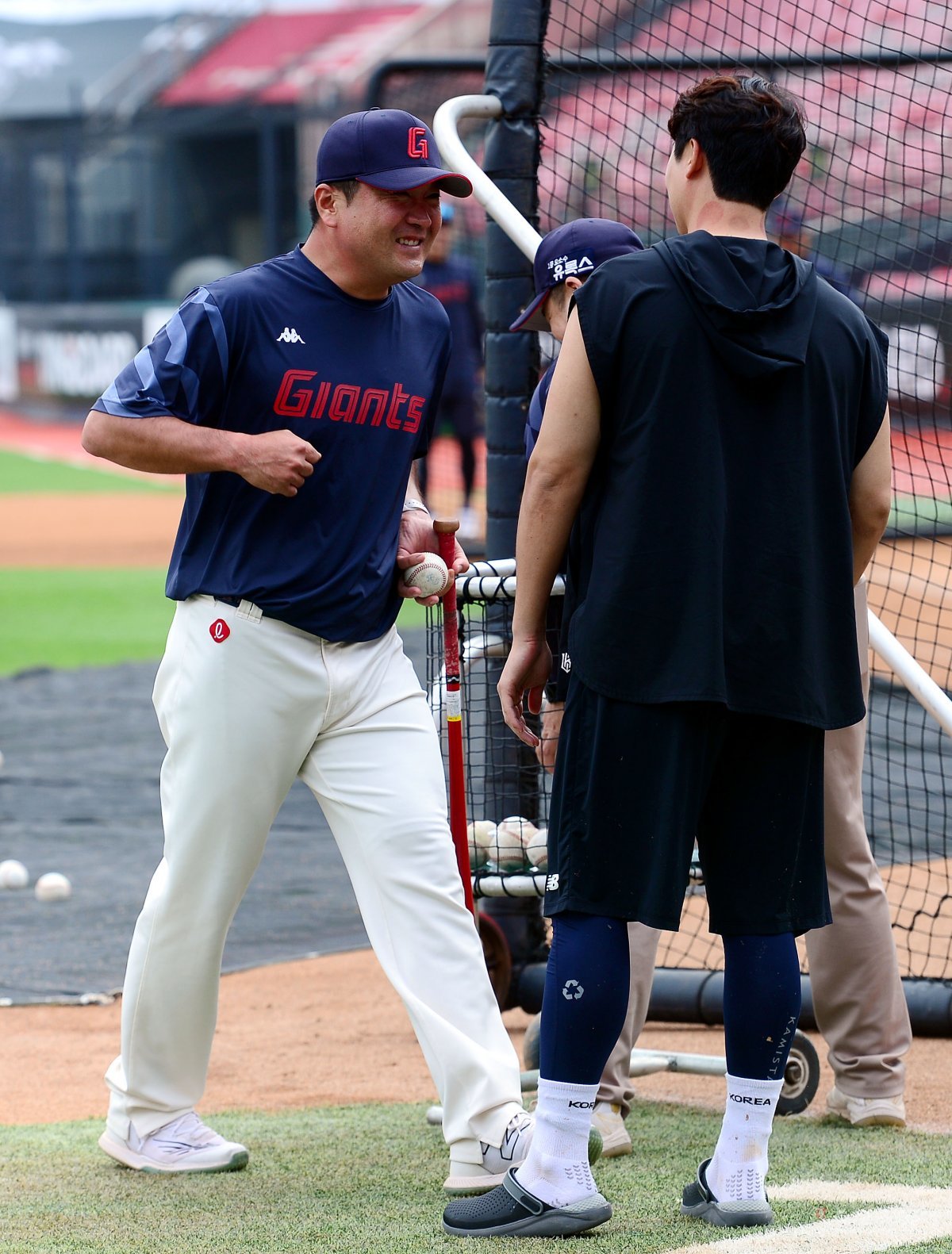 21일 경기도 수원 kt위즈파크에서 ‘2023 신한은행 SOL KBO리그’ kt 위즈와 롯데 자이언츠의 경기가 열린다. 경기 전 롯데 문규현 코치가 kt로 트레이드 된 이호연과 장난을 치고 있다.