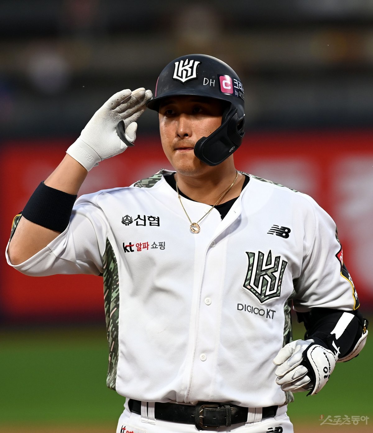 21일 경기도 수원 kt위즈파크에서 ‘2023 신한은행 SOL KBO리그’ kt 위즈와 롯데 자이언츠의 경기가 열렸다. 4회말 1사에서 kt 황재균이 안타를 날린 후 세리머니를 펼치고 있다.